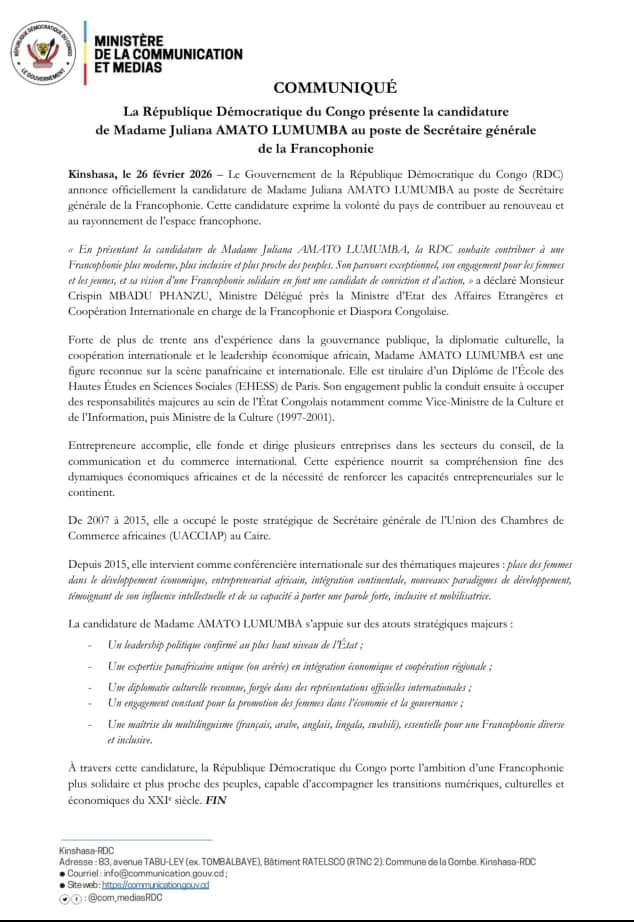 Le gouvernement congolais a officiellement annoncé Juliana Amato Lumumba, comme candidate de la République démocratique du Congo (RDC), au poste de Secrétaire générale de l’Organisation Internationale de la Francophonie (OIF), lors de la prochaine l’élection prévue en novembre 2026.