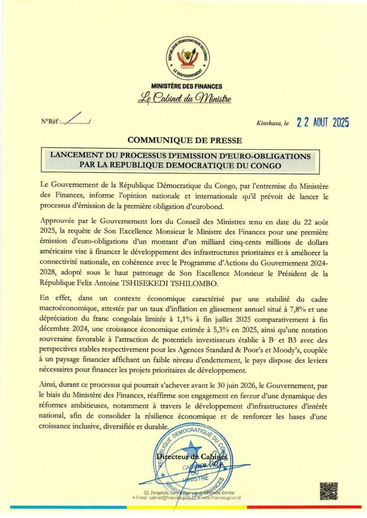Le Gouvernement de la République démocratique du Congo (RDC) annonce officiellement le lancement du processus d’émission de la première obligation d’ « eurobond » d’un milliard cinq-cents millions de dollars américains, visant à « financier le développement des infrastructures prioritaires et à améliorer la connectivité nationale ».